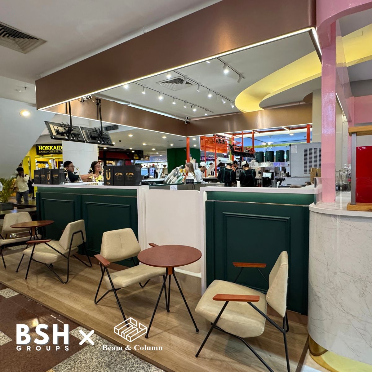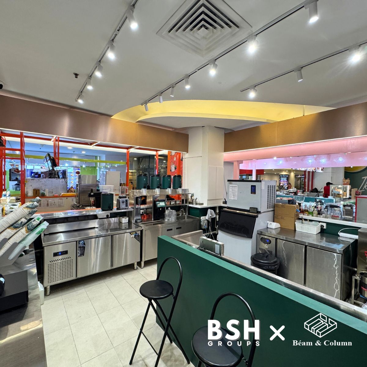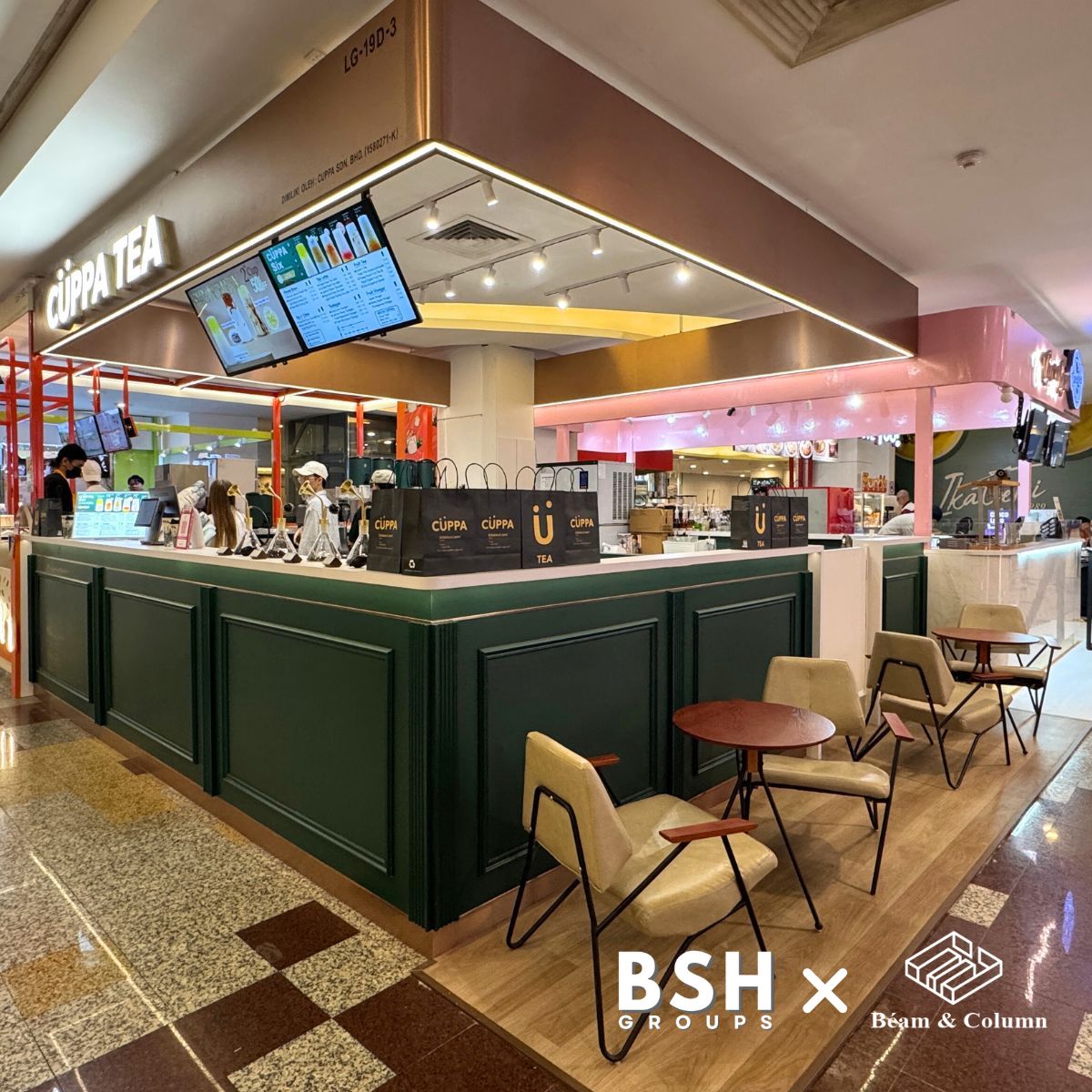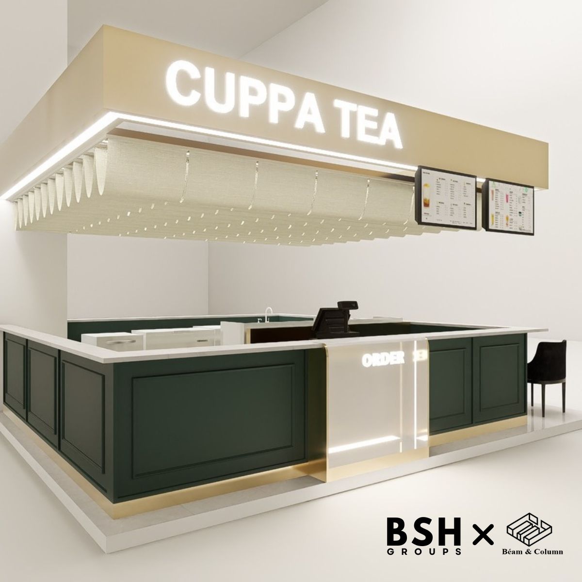 Cuppa Tea adopts a calm and inviting forest-inspired concept, using deep green tones combined with silver photo frames and a glowing LED logo to create a stylish yet natural visual appeal. Surrounded by soft seating, hanging TV display, and functional equipment, the space feels both refined and comfortable, ideal for casual tea breaks amid the buzz of the shopping mall.