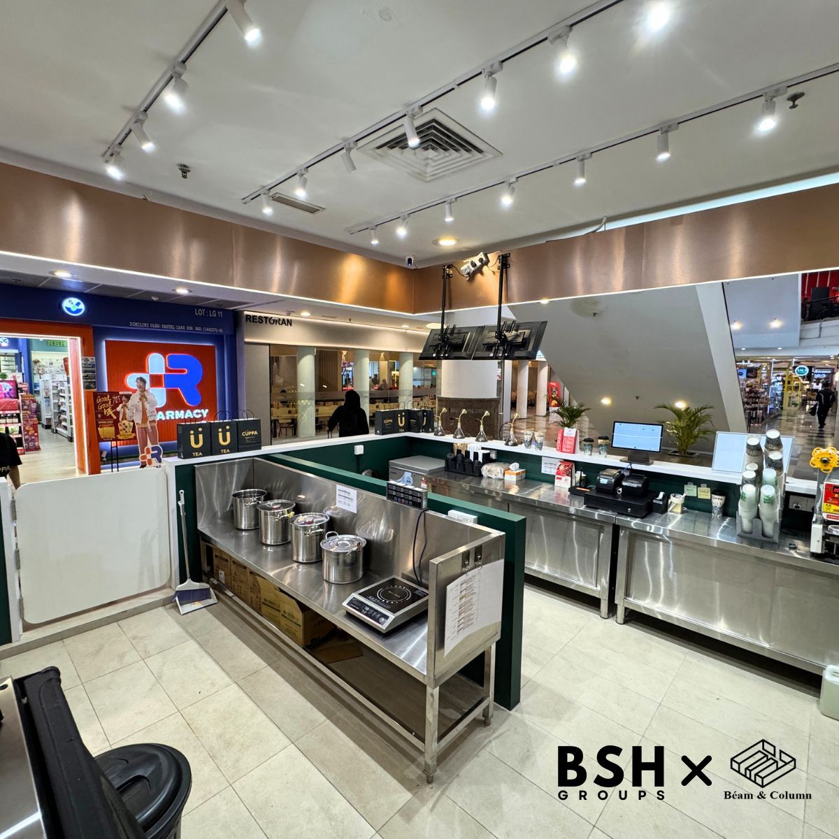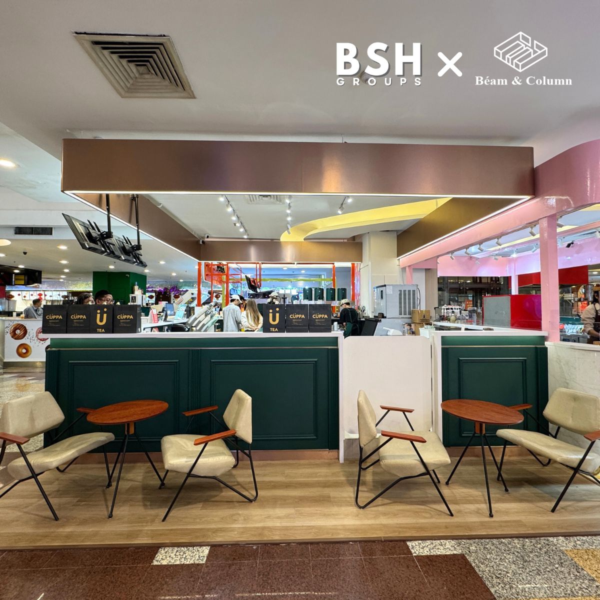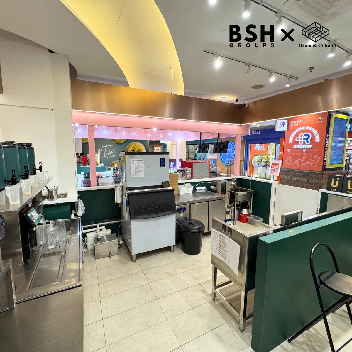 Cuppa Tea adopts a calm and inviting forest-inspired concept, using deep green tones combined with silver photo frames and a glowing LED logo to create a stylish yet natural visual appeal. Surrounded by soft seating, hanging TV display, and functional equipment, the space feels both refined and comfortable, ideal for casual tea breaks amid the buzz of the shopping mall.