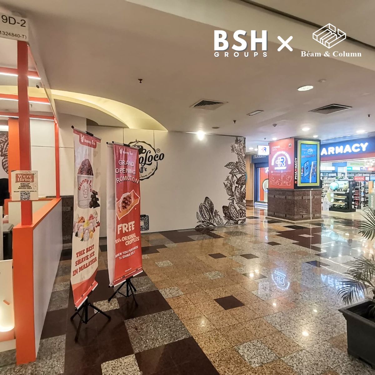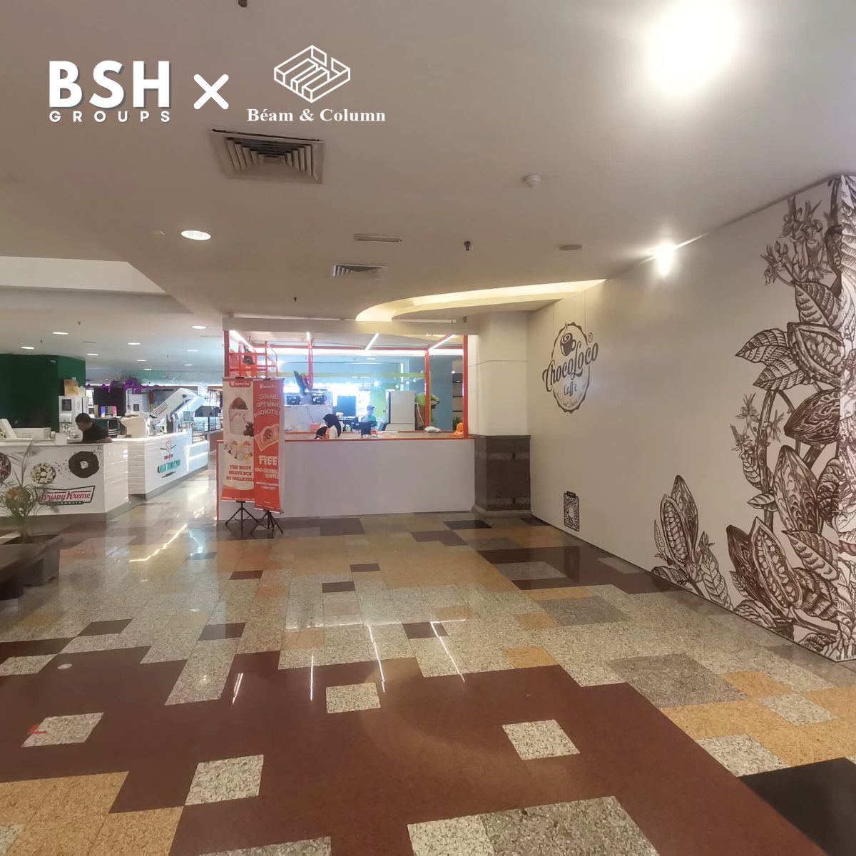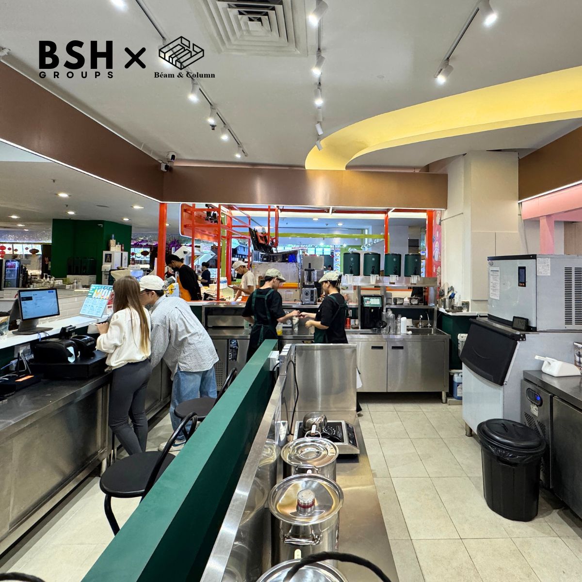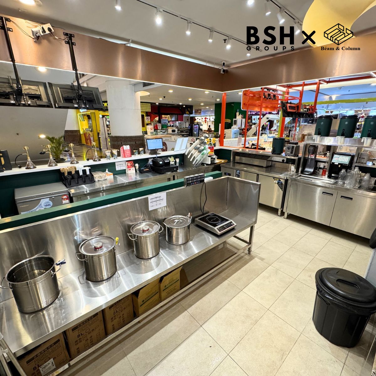 Cuppa Tea adopts a calm and inviting forest-inspired concept, using deep green tones combined with silver photo frames and a glowing LED logo to create a stylish yet natural visual appeal. Surrounded by soft seating, hanging TV display, and functional equipment, the space feels both refined and comfortable, ideal for casual tea breaks amid the buzz of the shopping mall.